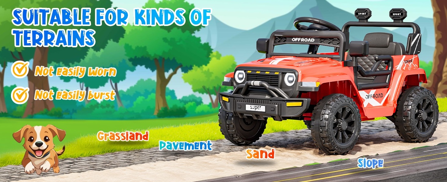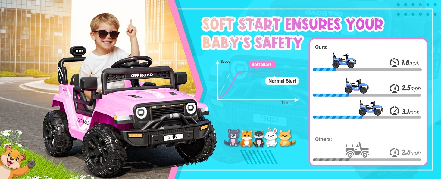 Ride ons are powered by the 12V 4.5AH battery and 2*30W motors. The battery offers 1-2 hours of playtime per charge, ensuring extended driving fun for your children. Equipped with two 30W motors, the kids electric car can easily reach a top speed of 3.1mph, providing an exhilarating and energetic riding experience that can easily conquer various terrains such as grass, brick roads, rubber roads, asphalt roads.