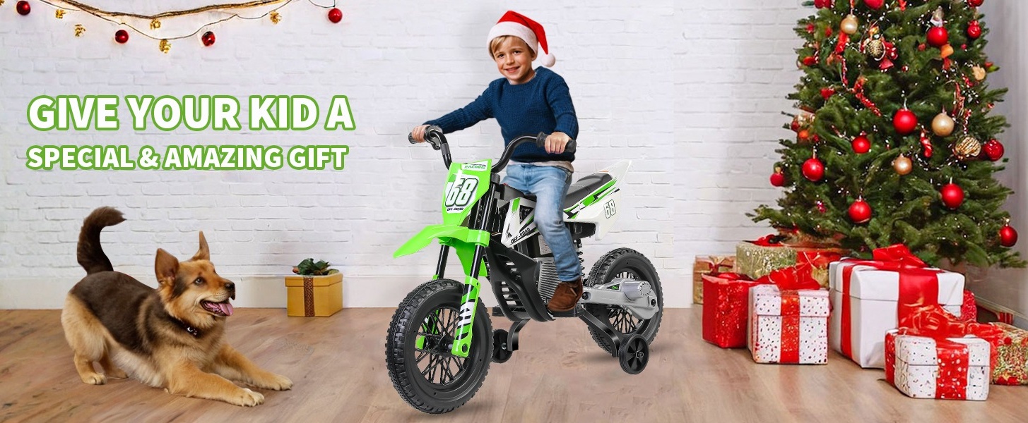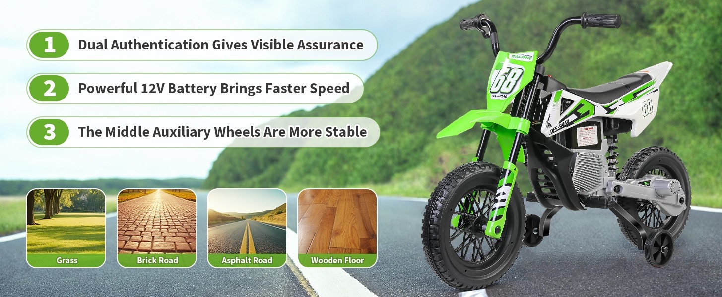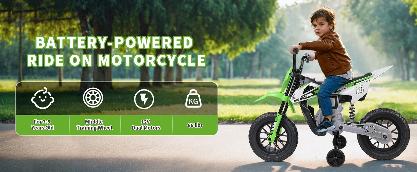 🚩Realistic Riding Experience: The unique middle training wheel and suspended design let kids really feel the thrill of riding a two-wheel dirt bike. The realistic twist grip throttle makes riding feel just like a real ride on motorcycle, and more interesting.