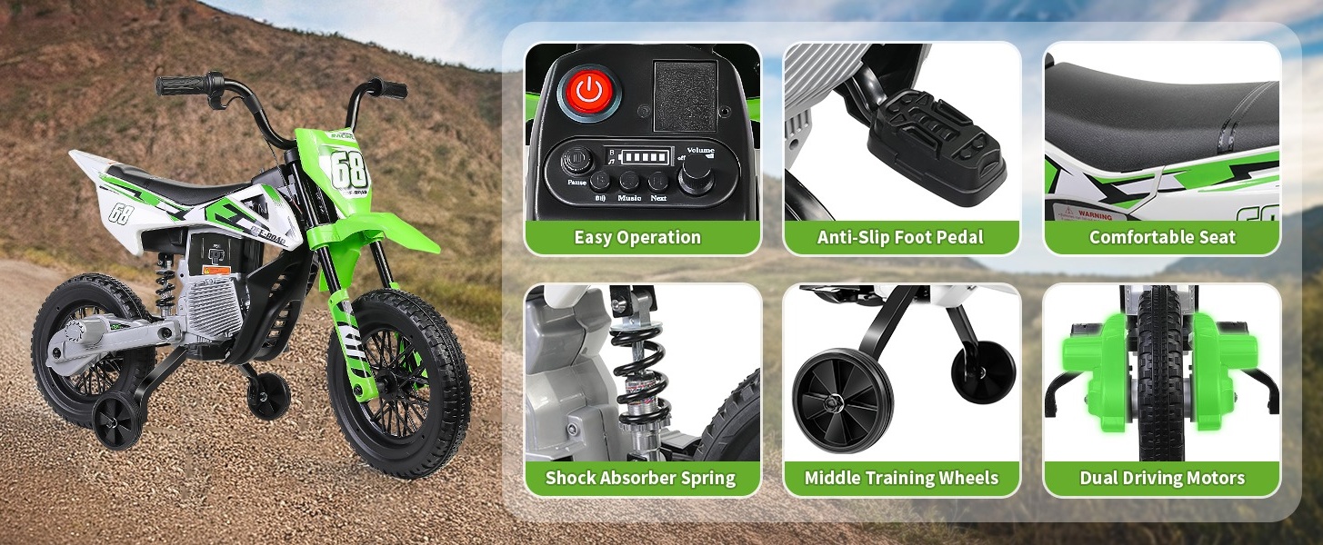 🚩Safe and Stable Ride: Equipped with training wheels, spring shock absorbers, anti-slip off-road tires, and anti-slip foot pedals, this dirt bike ensures a safe and steady ride, preventing accidental falls.