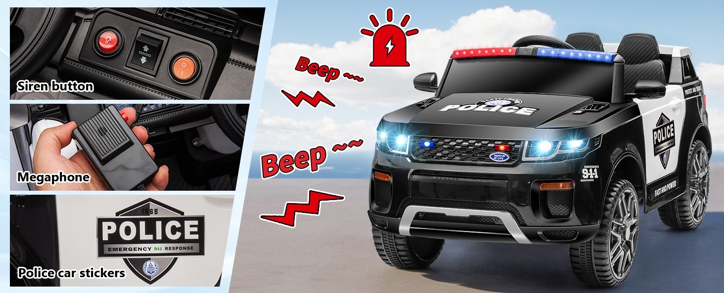 Realistic Police Car Design with Parent-Child Bonding: Introducing the ultimate kids ride-on police car, designed to make your child's dream of becoming a junior officer come true. This realistic replica features a genuine police look and functionality, complete with a megaphone for commanding roles, a siren for dramatic alerts, and bright LED headlights, taillights, and red/blue emergency lights for enhanced safety and visibility at night. Every ride becomes a vivid and lifelike adventure, ensuring that playtime is both thrilling and educational.
