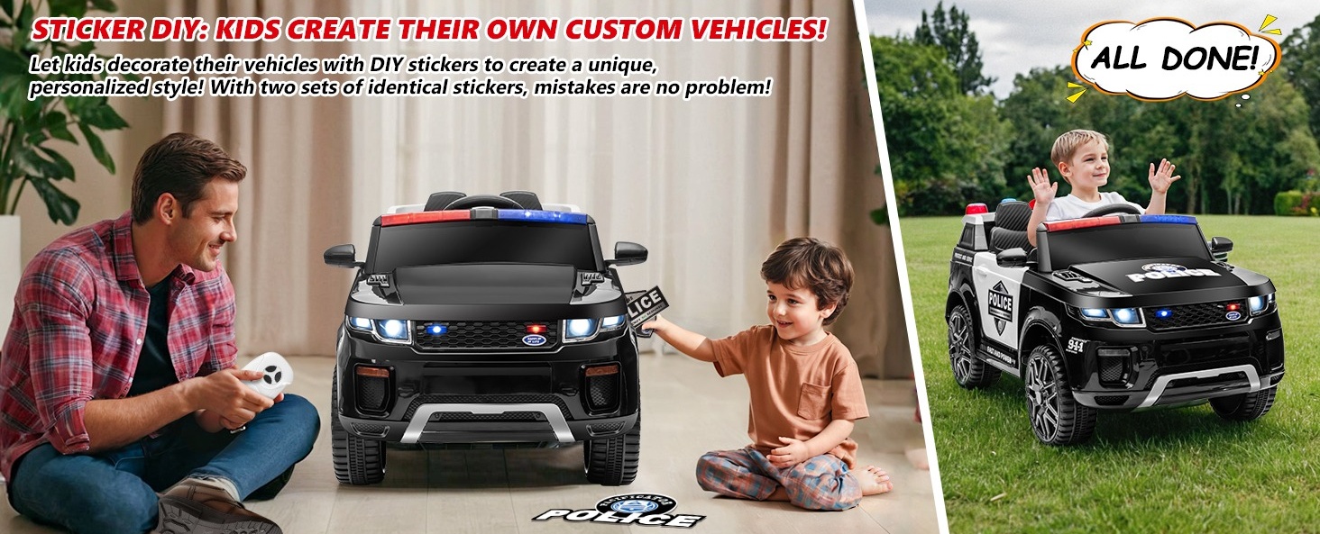 Stickers for Fun: Our electric ride-on police car for kids combines role play and creativity. We've included two sets of same DIY stickers to ensure your child's car stays as vibrant as their imagination. With a backup set, there's no worry about not having a replacement if your child tears the sticker after the first mistake; your kid can easily customize their toy, fostering creativity and pride.