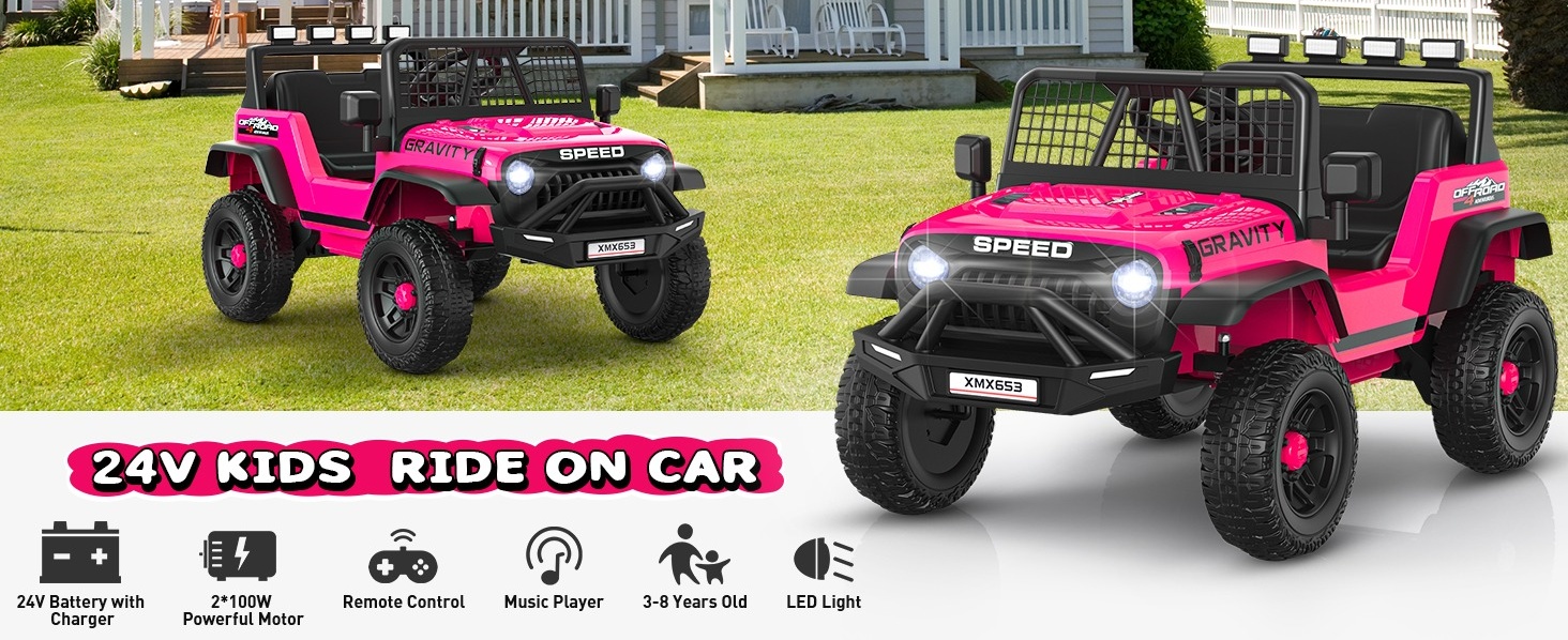 🚗24V Ride on toys 24V Ride on toys for kids is equipped with 24V battery and 2*100W motor, which can provide 1-2h endurance and maximum speed of 3mph. It can also be adjusted in 3 speeds to choose the most suitable driving speed for children, making driving safer and more comfortable.